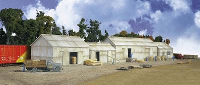 The Walthers Cornerstone Clayton County Lumber is a model of one of the most common trackside businesses. From tiny town to big city, small trackside warehouses are used by companies of every size and kind because they provide a handy place to store and protect merchandise shipped or delivered by rail. This versatile kit features four separate corrugated-metal buildings that are perfect for your steam or diesel-era railroad. Split them up and use them in several places along your railroad, or combine them into larger facilities. One building has an angled end wall to fit inside or outside a curved siding so it can be used in odd-shaped spaces. Signs for several businesses are also included in the Clayton County Lumber kit.
