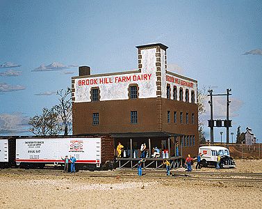 The Walthers Cornerstone HO Scale Brook Hill Farm Dairy is a three-story brick-and-stucco factory building that has plenty of uses on any steam or diesel-era layout. Featuring loading docks for railroad and truck shipments this classic building also includes colorful sign decals and milk cans for added dock detailing. Parts come molded in three colors plus clear plastic. Brook Hill Farm Dairy is one of many Cornerstone, Trainline and SceneMaster HO Scale structures and outbuildings.