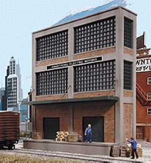 The Walthers Cornerstone HO Scale Armstrong Electric Motors Background Building is a great way to add an industry to your layout between your rearmost tracks and your backdrop. Like many big city buildings, this factory has a covered concrete freight car loading dock. Install a spur and add more operating fun to the small space between your layout and background scene. Great by itself or as a part of an entire complex along your background. Armstrong Electric Motors is one of many Cornerstone HO Scale industry kits.