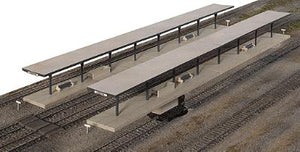 Building a detailed terminal scene for your passenger trains is easy with this kit. Based on the almost universal Butterfly design, platforms of this type can be found at stations in big cities and outlying suburbs where they have served passengers for many years. The kit includes parts for four complete platforms and features a modular design so you can combine multiple kits to make longer platforms. To get passengers to and from trains safely, a pair of optional underground subway stairway entrances are included to add realistic detail without a lot of work. Wooden walkway crossings between tracks, platform benches, detailed steel columns, platform signboards and realistic details are all included. Ideal for use with any steam, transition or diesel-era layout, these train depot platform shelters look great alongside Cornerstone Union Station 933-3094, sold separately, and similar station facilities. The Butterfly-Style Station Platform Shelters kit is one of a wide variety of Cornerstone HO Scale railroad structures.