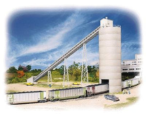 The Walthers Cornerstone N Scale Western Coal Flood Loader puts big action in a small space on your railroad. With today's "just in time" coal delivery, meeting customer schedules demands equipment that's up to the job. Based on large-silo coal loaders, flood loaders like this are now used in both eastern and western coalfields. Essentially storage silos that hold tons of coal for quickly loading unit train gondolas and hoppers, these large structures are fed by conveyor systems from mines and coal processors or washers that can be miles away - perfect for adding a large industrial shipper along your railroad without modeling the huge associated coal mine shaft or pit - it's implied it's somewhere off the layout! The Western Coal Flood Loader includes a variety of rooftop machinery that puts realistic detail in this highly visible location. Modular conveyor sections can be arranged in a variety of ways, or combined with other buildings like the New River Mining Company, (933-3221) or Glacier Gravel (933-3241, this structure is similar to a coal crusher-grader) to model a complete scene. Stackable loading silo sections allow you to easily build a tall or short structure that can fit wherever overhead clearance may be limited, such as on multi-deck layouts. As shown the kit measures 16 x 2-7/16 x 9-5/8" 42.5 x 6.1 x 24.4cm. Conveyor sections are each 4-1/4" 10.8cm long.