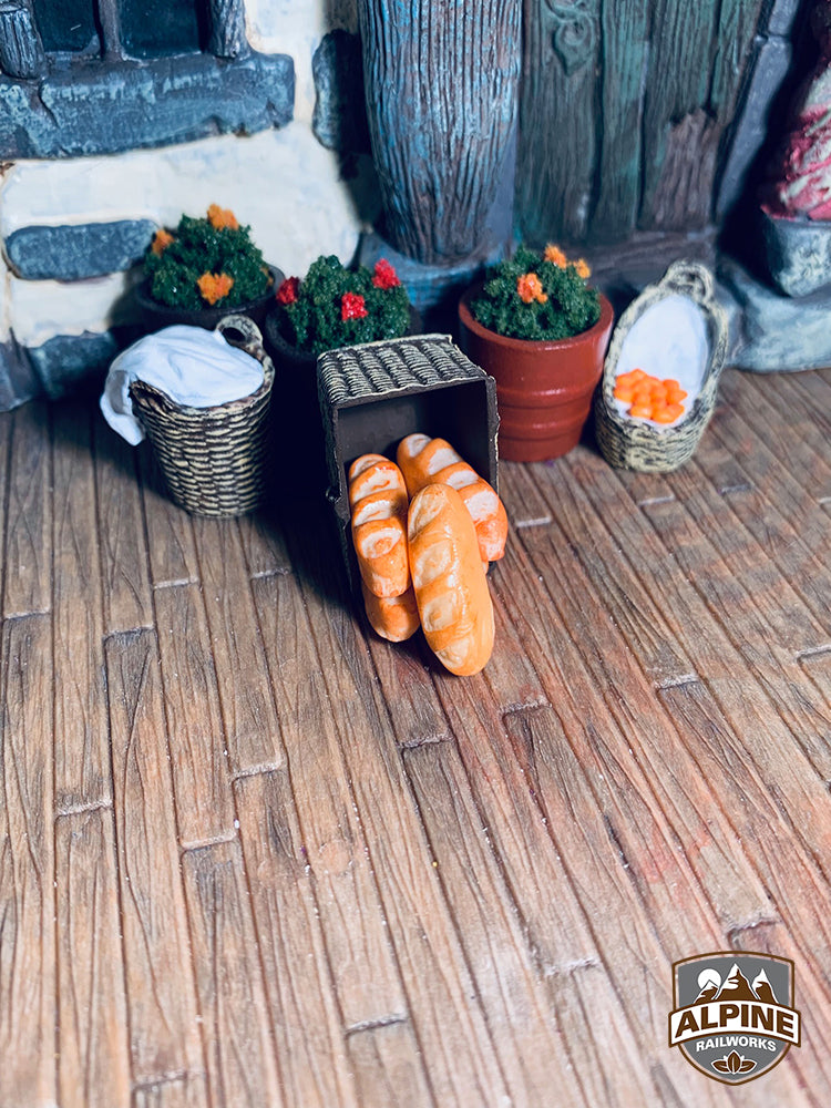 Figures and additional accessories are pictured for illustrative purposes only, and are not included. These G Scale miniature food pieces will fade in color with prolonged exposure to sunlight. This is a genuine Alpine Railworks product.
