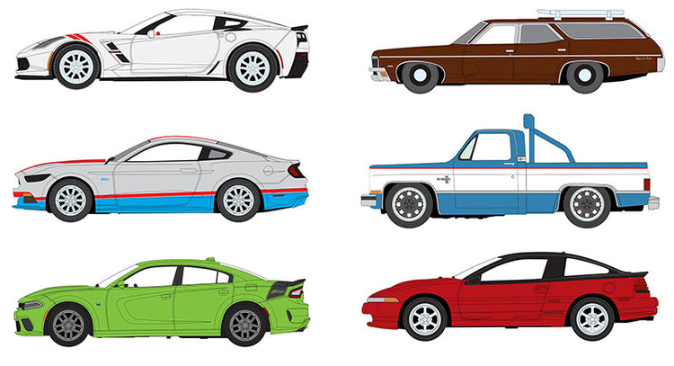 Auto World 64452-A-CASE 1/64 Premium 2024 Release 3A Diecast Car Set includes six precision-crafted 1/64 scale vehicles. Each model features authentic paint, rubber tires, and opening hoods, packaged in a factory-sealed case. Ultra Red chase cars may be included at random.