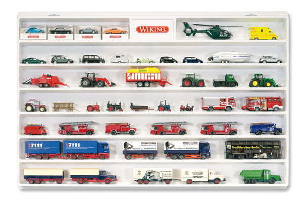 Show Case for Cars and Trucks This display case is made of high quality plastic and includes a clear plastic front cover. The height of the spaces is approxiAMTely 1-15/16 inches tall. * vehicles not included This is a genuine Wiking product.