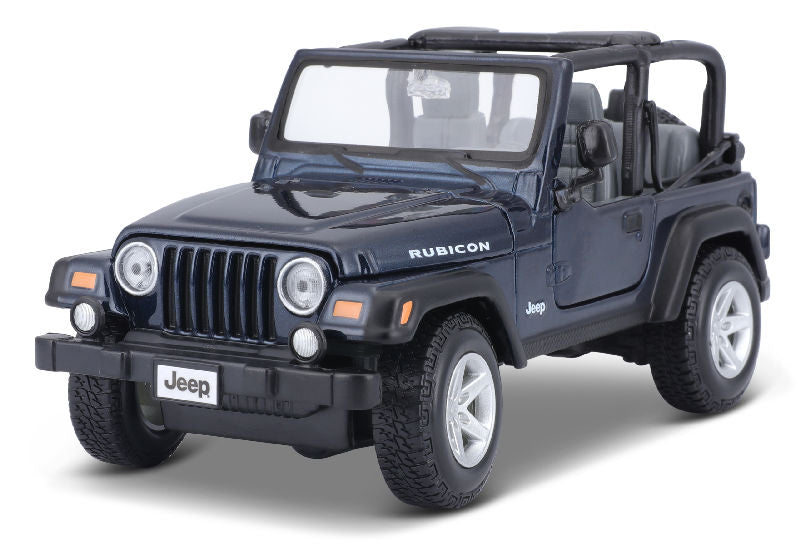 Jeep Wrangler Rubicon in Metallic Deep Blue Features:• Diecast metal body with plastic details • Opening doors • Opening hood • Detailed chassis This is a genuine Maisto product.