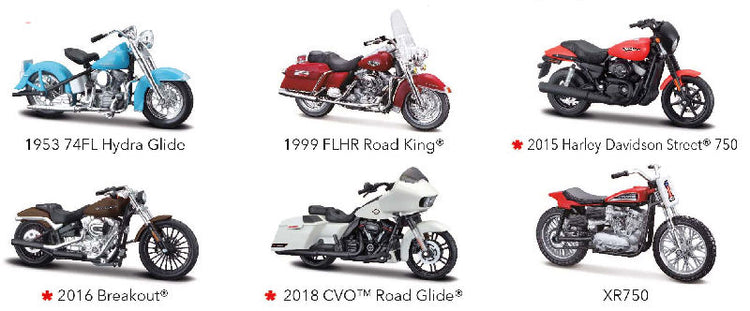 Harley-Davidson Series 40 - Twelve-Piece CASE Includes six different styles. Includes Two of each of the following bikes:• 1953 Harley-Davidson 74FL Hydra Glide• 1999 Harley-Davidson FLHR Road King• 2015 Harley-Davidson S This is a genuine Maisto product.