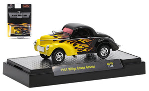 1941 Willys Coupe Gasser Features and Details: • Gassers Release 10 • Body is gloss black • Flames are bright yellow • Pin stripes are bright red • Interior is black • Rims headers ladder bars and grill are chrome • Glass This is a genuine M2Machines product.
