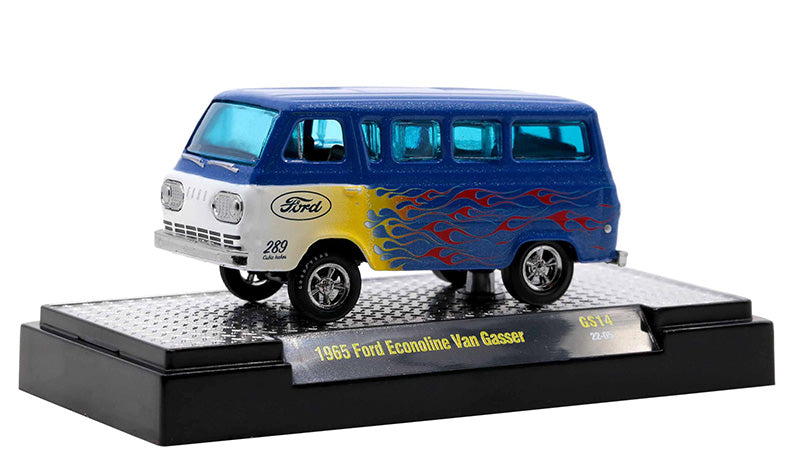 1965 Ford Econoline Van Gasser Features and Details: • Gassers Release 14 • The body is heavy blue metallic • The interior is black • The glass is clear blue • Limited Edition This is a genuine M2Machines product.
