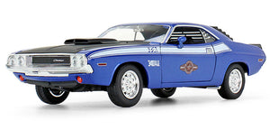 The Busted Knuckle Garage - 1970 Dodge Challenger in Blue • Diecast metal • Authentic engine detail • Opening doors and hood• Accurate detailed cab interior • Posable front wheels • Detailed undercarriage *Includes BKG license This is a genuine First Gear product.