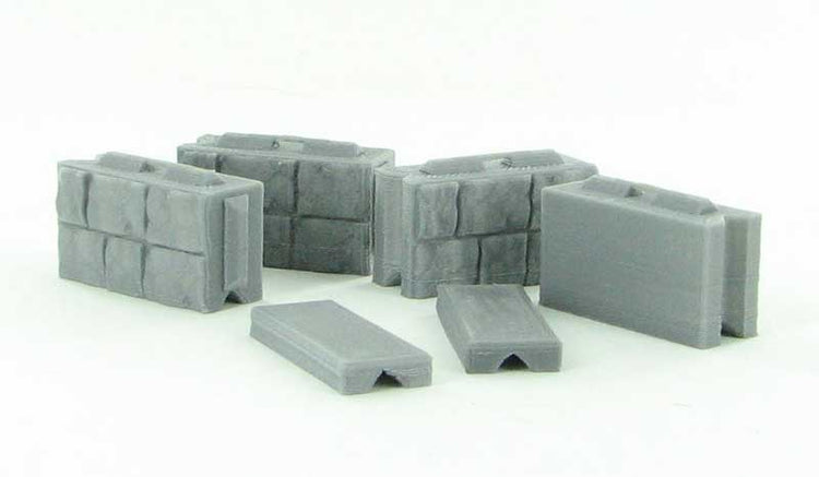 The 3D To Scale 50-130-GY Precast Wall Block Set Concrete Scenery is a versatile accessory for your 1/50 scale construction diorama or model train layout. Item number 50-130-GY includes four concrete-style blocks and two cap pieces, each block measuring approximately 1.25 inches long. These are ideal for simulating retaining walls, barriers, or industrial storage zones.