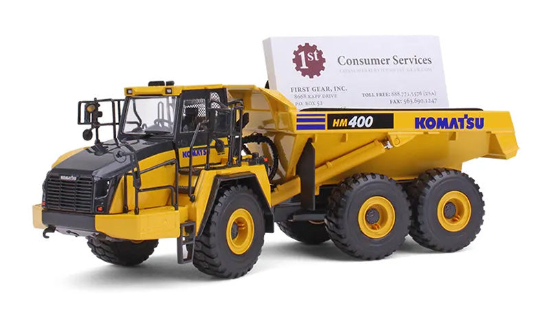 Komatsu HM400-5 Articulated Dump Truck Business Card Holder Features and Details: • Diecast metal replica • Accurately detailed cab interior • Tilting dump body • Business card holder tray included This is a genuine First Gear product.