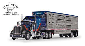 The DCP 60-1204 1/64 John Wayne Cattle Co. Diecast Peterbilt Truck pays tribute to the rugged spirit of the American West with a bold Peterbilt Model 389 and a silver livestock trailer wrapped in John Wayne Cattle Co. graphics. Built by Die-Cast Promotions under First Gear, this 1/64 scale model features a high-roof sleeper cab, chrome accents, and a Wilson Silverstar trailer designed for cattle hauling realism. Perfect for Western-themed layouts or patriotic displays, this collectible evokes the grit and legacy of John Wayne's ranching heritage.
