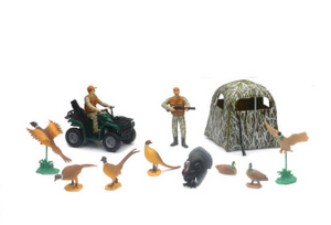 Fowl Hunting Playset Playset Includes• 4-Wheeler• Two Hunter Figures• Two Shotguns• Four Hunting Dogs• Hunting Blind• Three Ducks• Wild Turkey Made of durable plastic This is a genuine New Ray product.