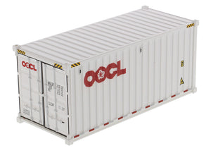 The Diecast Masters 91025B 1/50 OOCL 20' Shipping Container features a white body with red OOCL branding and corrugated side panel detailing. This 1/50 scale diecast model includes molded corner castings, locking door detail, and a stackable design. Built from diecast metal with plastic components, it's compatible with 1/50 scale skeletal trailers and container handlers.