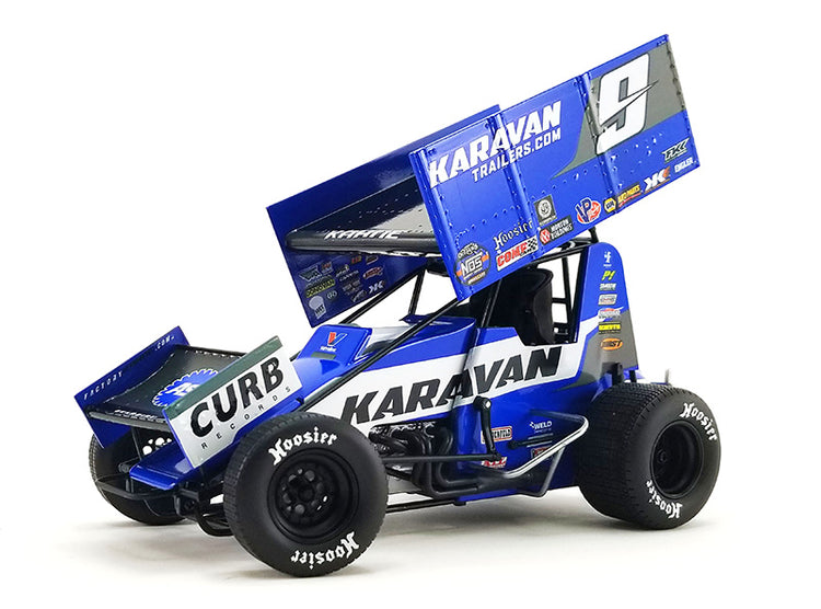 The Acme A1809510 1/18 2021 #9 Karavan Trailers Sprint Car - Diecast Racer is a high-detail replica of the World of Outlaws sprint driven by Kasey Kahne. With bold graphics, realistic suspension, and a wired engine, this model is built for fans of dirt track speed.