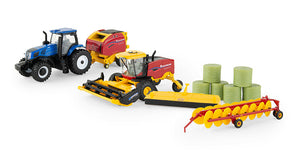 New Holland Haying Playset Playset Includes:• Speedrower 220• Genesis T8.350 Tractor • Roll-Belt 560 Round Baler• 6 round hay bales• Hay rake This is a genuine Ertl product.