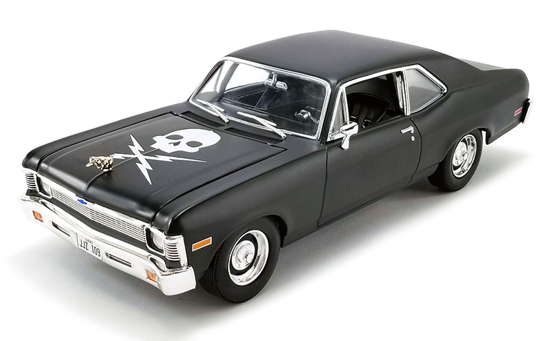 1971 Chevrolet Nova in Matte Black as driven in horror film Death Proof Features include: • Opening hood • Chevy 350 engine with headers • Rallye wheels • Driver race seat Newly Tooled Items Include: • Hood Ornament b This is a genuine Gmp product.