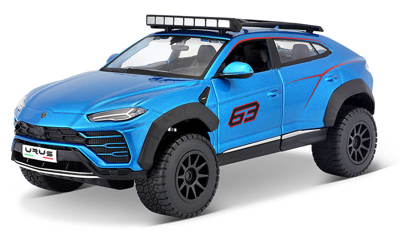 Lamborghini Urus in Metallic Blue - Off-Road Series Features • Opening doors and hood • Diecast metal body This is a genuine Maisto product.