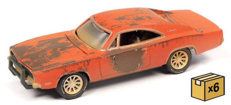 1969 Dodge Charger in Weathered Orange with Faded Graphics - 6 pieces in a Non-Returnable Factory-Sealed CASE Features include: • Diecast metal body and chassis • Opening hood • Detailed engine Now is your chance to hunt for the This is a genuine Johnny Lightning product.