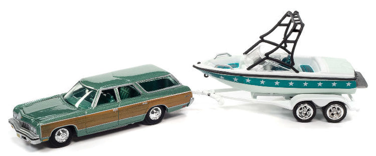 1973 Chevrolet Caprice Woody Wagon in Two Tone Green with Mastercraft Boat and Trailer Features include: • Diecast metal chassis • Authentic factory and custom colors • Removable diecast ramps stored underneath trailers • Functiona This is a genuine Johnny Lightning product.