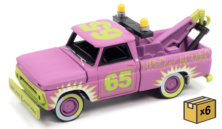 1965 Chevrolet Tow Truck in Flat Bright Purple - Demolition Derby - 6 pieces in a Non-Returnable Factory-Sealed CASE Features include: • Diecast metal body and chassis • Opening hood Now is your chance to hunt for the WHITE LIGHTNI This is a genuine Johnny Lightning product.