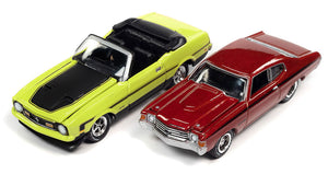 Class of 1972 Twin Pack Die-cast metal body and chassis Twin Pack Includes the following: • 1972 Ford Mustang Convertible in Bright Lime with Flat Black Hood & Side Stripes• 1972 Chevrolet Chevelle SS Heavy Chevy in Orange Flame with Heavy This is a genuine Johnny Lightning product.
