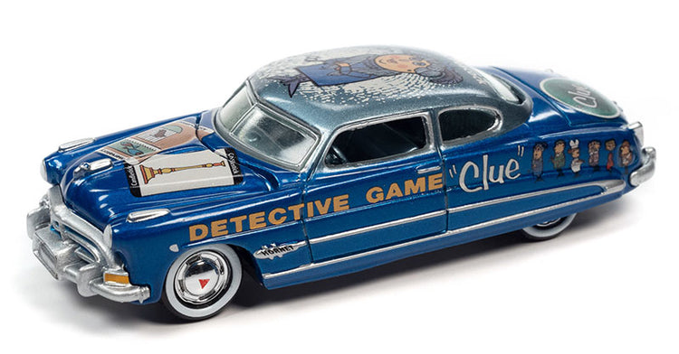 Vintage Clue - 1951 Hudson Hornet Mrs. Peacock/ Conservatory/Candlestick with Poker Chip in Lagoon Blue with Bali Blue Top and Clue Graphics Features include: • Diecast metal body and chassis • Includes exclusive collector token This is a genuine Johnny Lightning product.