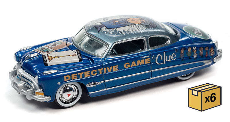 Vintage Clue - 1951 Hudson Hornet Mrs. Peacock/ Conservatory/Candlestick with Poker Chip in Lagoon Blue with Bali Blue Top and Clue Graphics 6 pieces in a Non-Returnable Factory-Sealed CASE Features include: • Diecast metal body and chassi This is a genuine Johnny Lightning product.