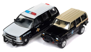 American Heroes Twin Pack Twin pack includes:• Texas Dept of Public Safety - 1997 Chevrolet Tahoe in Gloss Black with White Roof and Hood• Florida State Trooper K9 - Jeep Cherokee in Gloss Black with Tan Body Features include: • Diecast b This is a genuine Johnny Lightning product.