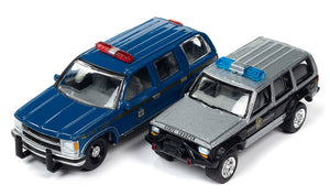 American Heroes Twin Pack Twin pack includes:• New York State Trooper - 1997 Chevrolet Tahoe in Blue with Lower Flat Black Sides• North Carolina State Trooper - Jeep Cherokee in Silver with Black Sides Features include: • Diecast body and This is a genuine Johnny Lightning product.