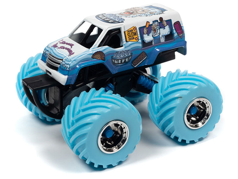 Frost Bite - I Scream You Scream! Monster Truck in Blue White and Purple with Blue Tires Features include: • Detachable metal body • Ultra-flex suspension This is a genuine Johnny Lightning product.