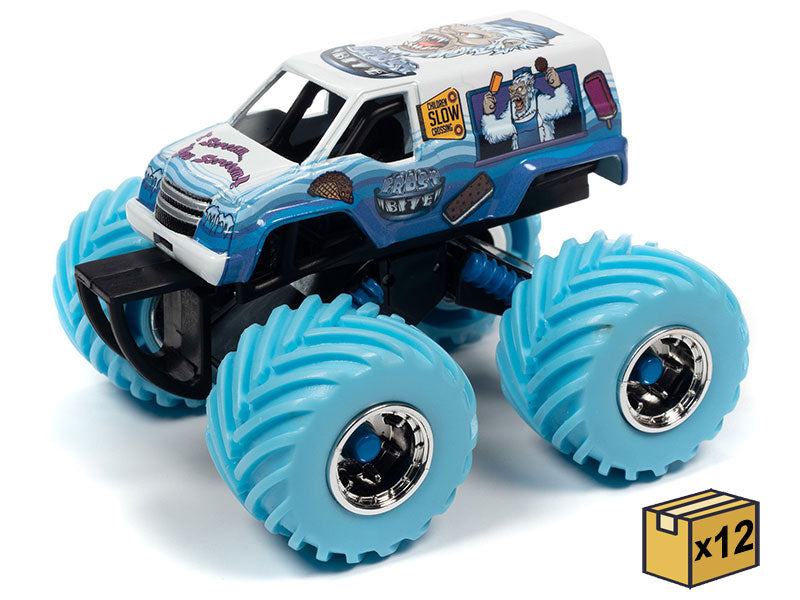 Frost Bite - I Scream You Scream! Monster Truck in Blue White and Purple with Blue Tires - 12 pieces in a Non-Returnable Factory-Sealed CASE Features include: • Detachable metal body • Ultra-flex suspension Now is your chance to hunt This is a genuine Johnny Lightning product.