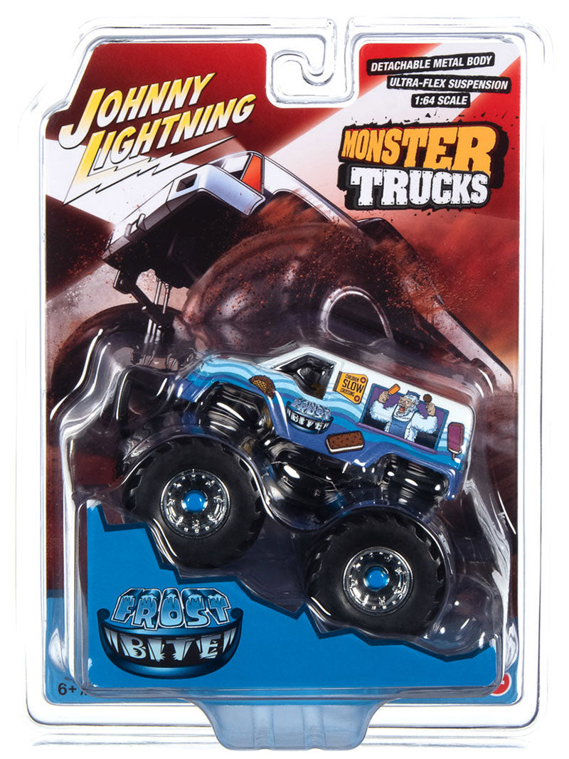 Frost Bite - I Scream You Scream! Monster Truck in Blue White and Purple with Black Tires Features include: • Detachable metal body • Ultra-flex suspension This is a genuine Johnny Lightning product.