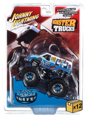 Frost Bite - I Scream You Scream! Monster Truck in Blue White and Purple with Black Tires - 12 pieces in a Non-Returnable Factory-Sealed CASE Features include: • Detachable metal body • Ultra-flex suspension Now is your chance to hunt This is a genuine Johnny Lightning product.