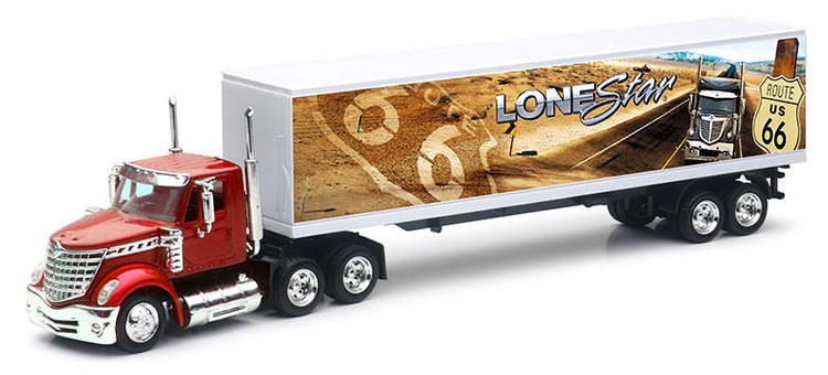 International Lonestar Semi Truck and Dry Van Trailer with Route 66 Graphics Cab is made of diecast metal the balance is durable plastic This is a genuine New Ray product.