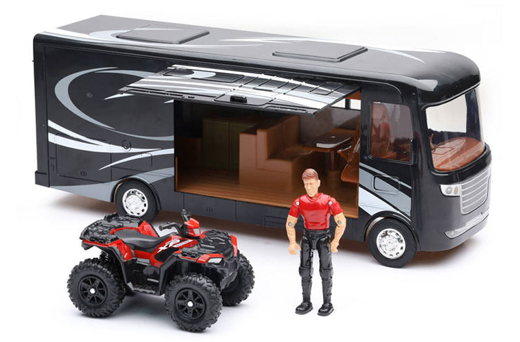 Xtreme Adventure RV Playset Playset includes • RV with opening side and rear door • ATV in red • Posable figure Scale is approximate Made of durable plastic This is a genuine New Ray product.