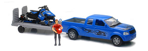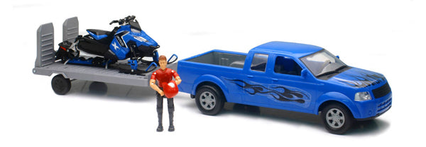 Pickup Truck in Blue with Black Decal with Flatbed Trailer and Polaris Switchback Snowmobile Includes action figure with helmet Made of durable plastic This is a genuine New Ray product.