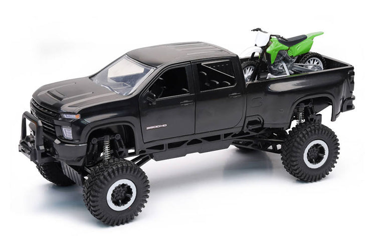 Chevrolet 3500 Off Road Pickup Truck in Black with Green Dirt Bike Made of durable plastic Doors open on truck This is a genuine New Ray product.