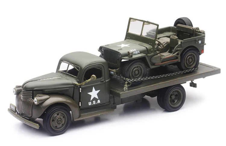 1941 Chevrolet Flatbed Truck in Military Livery Hauling a Jeep Willys Made of diecast metal with durable plastic parts This is a genuine New Ray product.