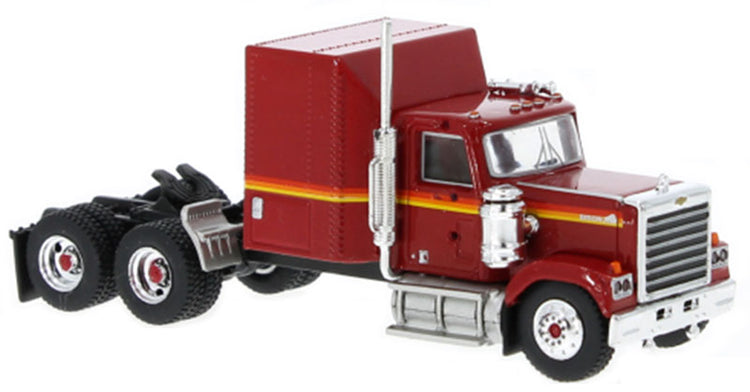 Brekina 85784 1/87 1980 Chevrolet Bison Black Diecast Model offers a sleek take on American trucking in a glossy black finish with sleeper cab styling and chrome accents. This 1/87 scale HO model replicates the Chevrolet Bison, a durable Class 8 truck used across North America for freight and logistics. With realistic grille work, dual exhaust stacks, and prototypical body lines, it's ideal for night scenes, industrial layouts, or collector displays. The black finish adds elegance and power to any HO scale fleet.