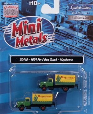 CMW 50448 1/160 Mayflower 1954 Ford Box Truck Diecast brings moving day realism to your layout in a green and white finish with Mayflower graphics and box truck styling. This 1/160 scale model replicates the 1954 Ford delivery truck used for household relocations and commercial freight. With sponsor detailing, chrome trim, and realistic cab proportions, it's perfect for urban scenes, logistics dioramas, or brand-themed layouts.