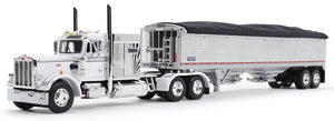 The DCP 60-1908 1/64 Peterbilt Model 359 Semi Truck Diecast features a clean white and chrome finish paired with a 43-foot Wilson high-sided grain trailer. Built by Die-Cast Promotions under First Gear, this 1/64 scale model replicates vintage long-haul rigs with a 60" flat top sleeper and classic grille styling. Ideal for collectors who appreciate retro realism and agricultural fleet themes.