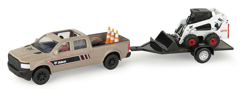 Bobcat Skid Steer Playset Playset includes• Pickup truck• Flatbed trailer• Bobcat Skid Steer• 1 Action figure• 3 Caution cones Made of durable plastic This is a genuine Ertl product.