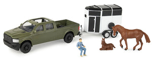 Pickup Truck in Green with Horse Trailer and Horses Features Include: • Open roof to add driving figure • Opening back gate and side door on trailer Made of durable plastic This is a genuine Ertl product.