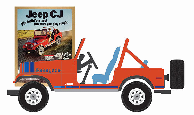 We Build 'em Tough Because you Play Rough - 1979 Jeep CJ-7 Renegade Vintage Ad Cars Series 11 • Chrome Accents • Metal Chassis • Real Rubber Tires • True-To-Scale Detail • Limited Edition This is a genuine Greenlight product.