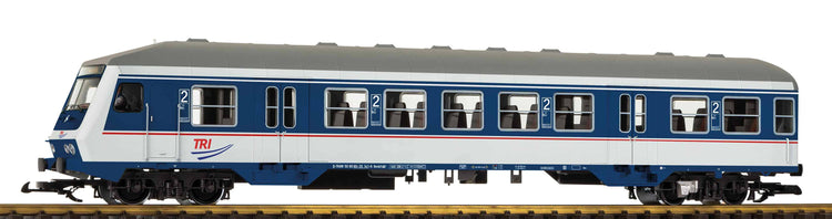 The Piko 37637 G Scale TRI VI Control Car Wittenberg is a modern cab coach used by TRI Train Rental for push-pull charter and special event service. Its white and red livery and streamlined cab design make it ideal for contemporary layouts, excursion trains, or promotional consists.