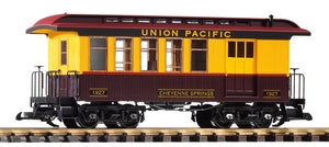 The Piko 38673 G Scale UP Combine 1927 is a narrow-gauge passenger and baggage car decorated in Union Pacific livery. It features molded-on wood-style detailing, sliding baggage doors, interior compartments, and metal wheels. Knuckle couplers are factory-installed, and the car is lighting-ready.