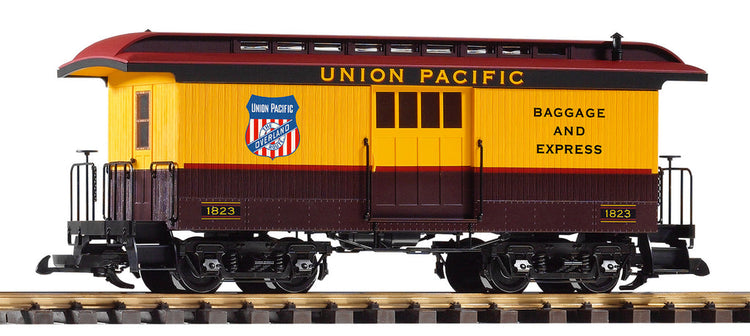 The Piko 38675 G Scale UP Baggage Car 1823 is a narrow-gauge baggage car decorated in Union Pacific livery. It features molded wood-style detailing, sliding baggage doors, and metal wheels for smooth operation. Knuckle couplers are factory-installed, and the car is lighting-ready for enhanced realism.