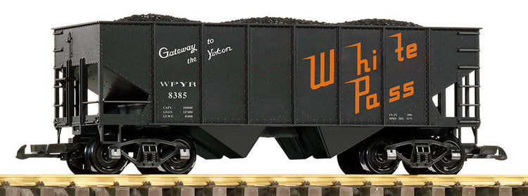The Piko 38964 G Scale WP&YR Rib-Side Hopper with Coal Load features a two-bay rib-sided hopper decorated in White Pass & Yukon Route livery. It includes a removable simulated coal load, molded-on handrails, stirrup steps, and offset side design. Durable plastic wheels and hook-and-loop couplers are standard.