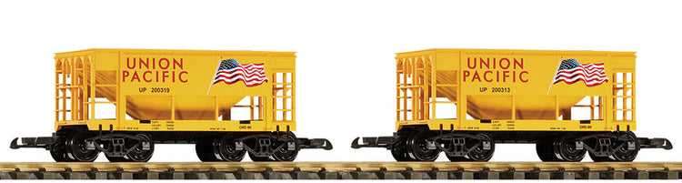The Piko 38950 G Scale UP Ore Cars Flag 2-Pack includes two single-bay open-top ore cars decorated in Union Pacific livery with American flag graphics. Each car features molded-in ladders, stirrup steps, and crisp lettering. Durable plastic wheels and hook-and-loop couplers are standard.